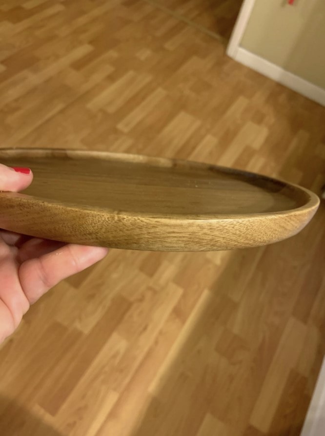These plates are exactly as pictured. They have a large, flat surface, which holds a good amount of food...either as a platter or dinner plate. The finish has a nice sheen. They are well sanded, and have held up perfectly through several washes.
