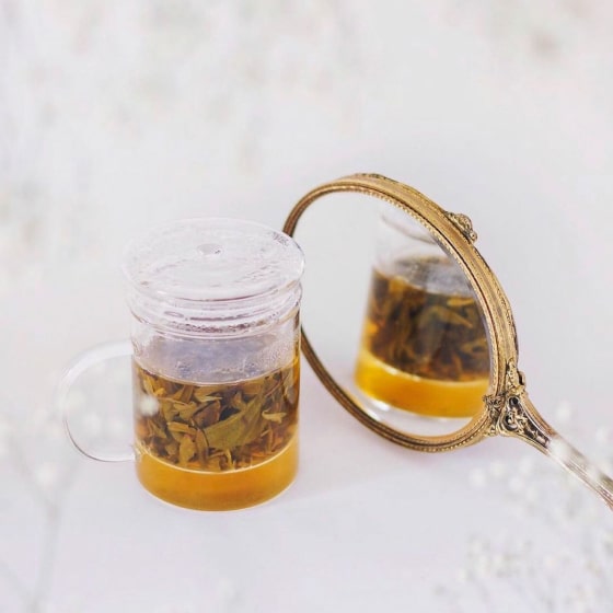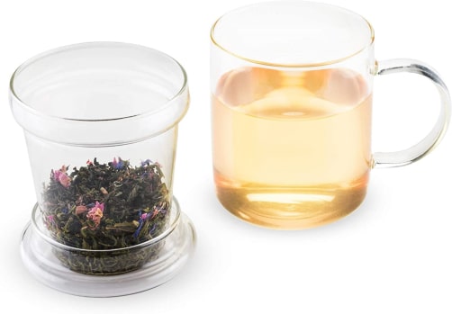 This is my favorite steeping mug. I love that it is clear so I can see my tea, and that the steeper sits in the lid when the steep time is up! It is not double walled, which allows you to really see the tea and is more beautiful. It is a little fragile, but to me, this helps me practice mindfulness as I sip.