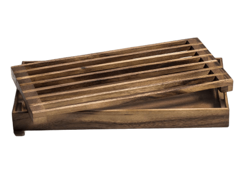 Very smart idea to make a bread crumb catcher. It is basically a cutting board that helps you organize your kitchen properly. No need to wipe your counter every time you cut bread anymore and we all know how messy it can be. The wood is dark, perfect for my kitchen and you can turn it into a tray by removing the top part. Good quality and worth the money.