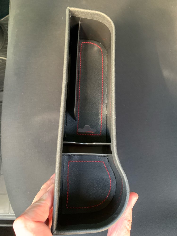 I love this gap filler, a nice addition to my car. Great fit. Not too big, not too small, and matches my leather seats. you can fit a can of soda, water bottle, cellphone, and miscellaneous items. Great quality product