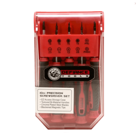 This is a nice 10-piece set of precision screwdrivers with magnetic tips. Included are two slotted (flathead), two Phillips head, two aster (star), and four torx screwdrivers and a plastic case that is easy to open, close, and store. It's also easy to identify which screwdriver you are grabbing since they are labeled on the back end (very nicely presented when the case is open) and inside the case itself when it is closed. These are ideal for dealing with small electronics (laptops), phones/tablets, gaming systems, or sunglasses. Nice to have around and easy to use.