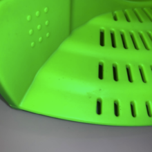 This makes it so much easier to dump out water when making pasta of any type. Fits very well to most sized pans and dishwasher safe. My 9 yr old granddaughter can now dump the water out of the Mac and cheese easily. This is a must have for people who make Pastas of any kind that require dumping out hot water. It is made out of a type of rubber so I’m not sure if I would use it for hot grease, but it may be ok for that too since a lot of spatulas etc are made from similar material